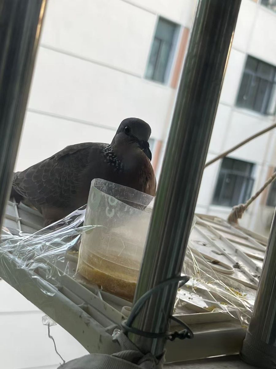 我注意到,斑鸠正低头啄食着窗台上的小米,那是我们特意为它们准备的食物。看着它专注进食的模样,我的心中满是欣慰。窗外的建筑物在阳光的映照下显得有些朦胧,而这只斑鸠却成了此刻最动人的风景。它偶尔抬头张望,似乎在确认周围的安全,随后又安心地继续进食。