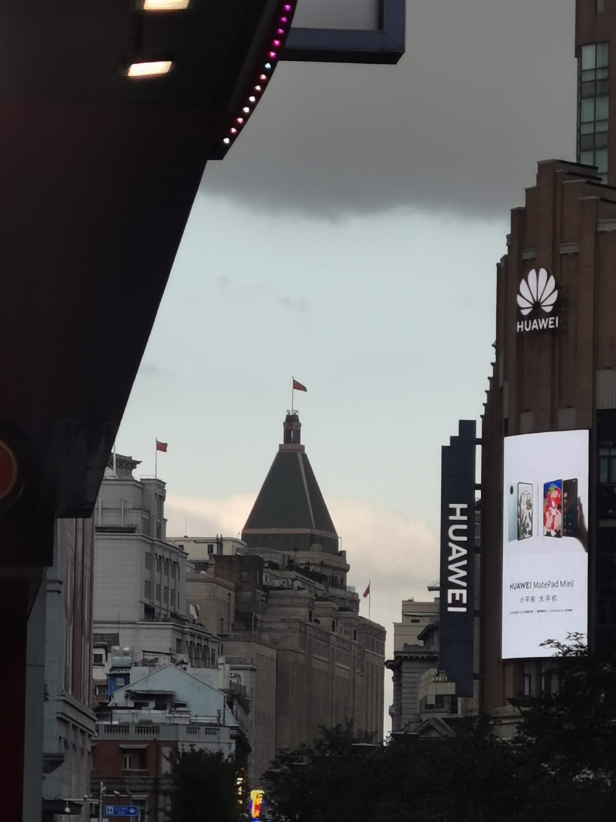 傍晚路过校门口,抬眼撞见这一幕:复古钟楼的尖顶戳破云层,华为的广告牌亮着科技感的光,旁边霓虹招牌的“烤肉”二字,又裹着烟火气的暖。